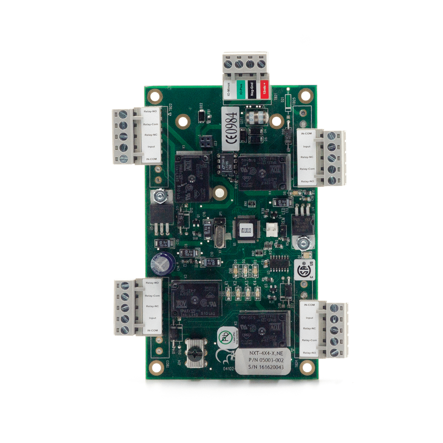 The NXT-4X4 Input/Output Expansion Module provides functionality to any Doors.NET access control system by adding auxiliary I/O that can be used for additional access control functionality, monitoring non-reader doors or other devices, and creating powerful action sequences by linking input triggers to outputs. The module can be connected anywhere along the RS-485 trunk, most commonly at the controller or near a reader. One module can be added per trunk, allowing up to an extra 8 inputs and 8 outputs on an NXT-2D Controller and an extra 16 inputs and outputs on an NXT-4D controller.