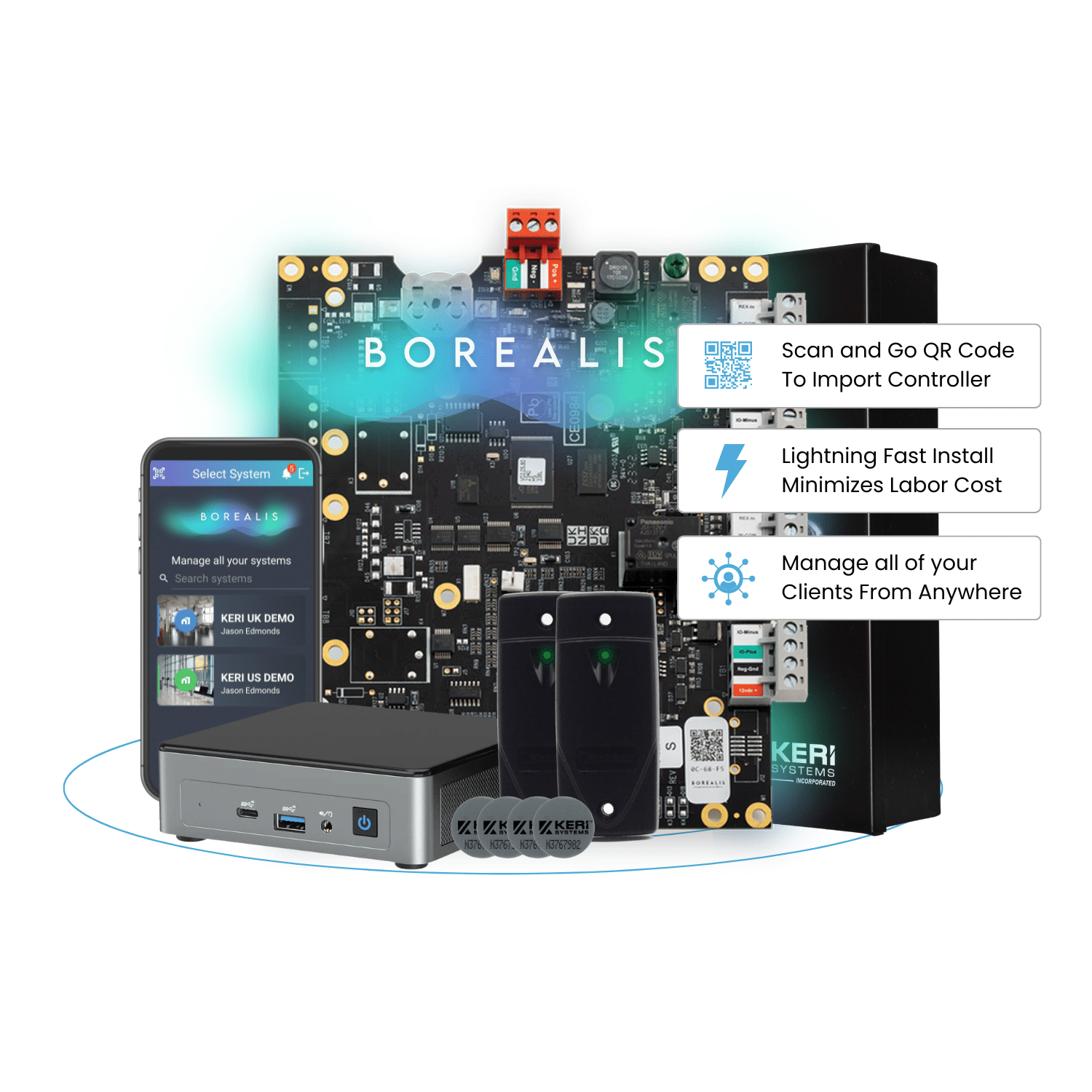 Borealis Kits include everything you need for a two—and four-door solution, connected directly to the cloud and hosted on AWS. There are no complicated part numbers or job lists.