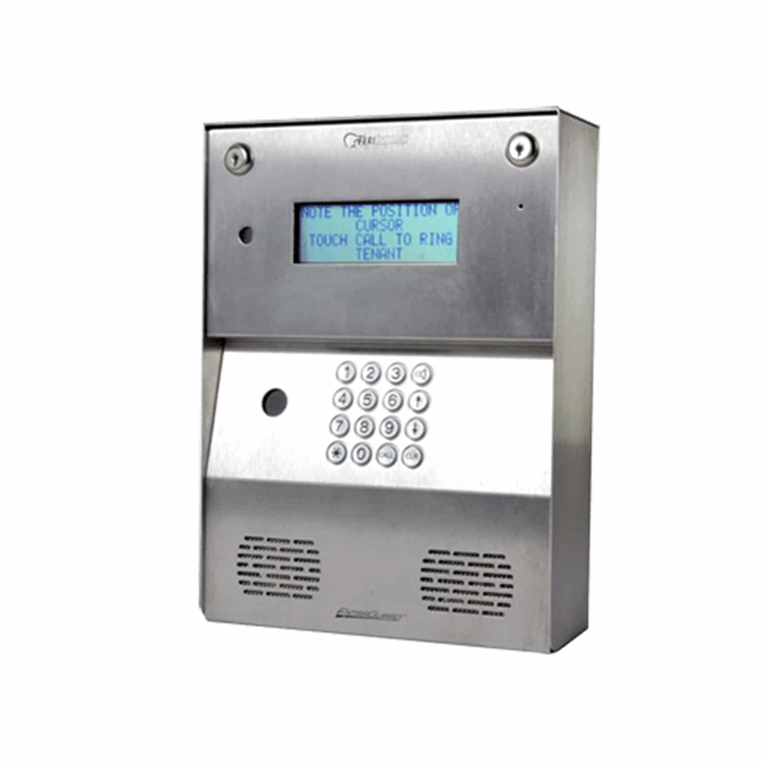 The rugged, stainless steel housing will stand up to the harshest conditions, and the keypad is lit by LEDs so there are no incandescent bulbs to replace. Each Entraguard Silver also has two extra relay outputs that can be used in a variety of ways, including turning on a lobby light, unlocking an interior door, etc., by tone commands from the tenant’s location or based on an access granted decision. An on-board modem is also included for remote programming.